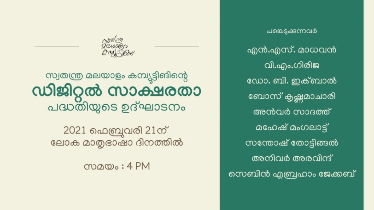 സ്വതന്ത്രമലയാളംകമ്പ്യൂട്ടിങിന്റെ ഡിജിറ്റൽ സാക്ഷരതാ പദ്ധതിയ്ക്ക് ഈ ലോകമാതൃഭാഷാദിനത്തിൽ (2021-02-21T10:30:00Z) തുടക്കമാവുകയാണ്.